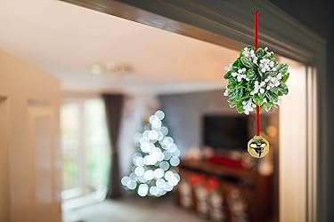 - Mistletoe Classic Style Ornament has artificial green leaves and white berries in a ball shape and is strung on a red ribbon with a bell at the bottom. It is a great ornament to hang on Christmas trees, in the doorway, or near any holiday decor. Kissing under the Mistletoe is an old European tradition. It is believed that the Mistletoe holds magical powers from the "soul" for the mighty Oak tree. It grants strength, peace, health, fertility, and love to those who kiss beneath it. This would be the perfect holiday gift for your friends and family. This Christmas decoration will create a beautiful warm holiday atmosphere in your home. Hanging Mistletoe is crafted of green leaves and white berries with a bell at the bottom. This unique bell ornament measures approximately 10" long and the mistletoe ball has a 4" diameter. This Ornament will be a beautiful add-on for your Home during the Christmas holiday season. This decorative piece is perfect for Christmas, winter weddings and as a holiday decorating accent. Ornativity manufacturers their items with care and quality to enhance your Christmas Experience.
