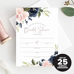 - Invite friends and family to celebrate the bride-to-be with this sweet and simple bridal invitation featuring watercolor painted greenery and navy and pink florals. Bliss Paper Boutique invitations are professionally designed and created by our in-house team. You won't find these designs anywhere else! ? PRODUCT DETAILS: - 25 pack of fill-in invitations - BONUS 25 white envelopes included (60# A7 white envelopes — perfect for mailing!) - Invitations sized at 5x7 inches — generous size allows plenty of room for writing - Invitations printed on high quality 100lb premium uncoated white card stock - Single sided design features a sweet and simple greenery, navy and pink floral design ? WHAT MAKES US UNIQUE: - 100% UNIQUE DESIGNS: Created by our in-house design team — you won't find these designs anywhere else! - HIGH QUALITY PAPER: Every product uses the finest quality papers. - OPTIMAL ENVIRONMENTAL CHOICE: Uncoated stock is acid-free and FSC certified and contains 10% post-consumer recycled content. - WE STAND BEHIND OUR PRODUCTS: We take pride in the quality of our products and the services we provide. - KNOW YOU’RE SUPPORTING A SMALL, FAMILY-OWNED BUSINESS: With an A+ Better Business Bureau rating. - USA MADE: Designed and printed in the USA.