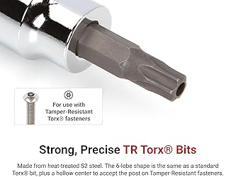 Includes 12-pc. 3/8 in. drive tamper-resistant Torx bit sockets: TR10, TR15, TR20, TR25, TR27, TR30, TR40, TR45, TR47, TR50, TR55, TR60; Socket rail S2 steel bit is press-fit into the socket for a straight, permanent connection that can't loosen over time Star-shaped Torx bit has 6-lobes and a hollow center to accommodate the post on Tamper-Resistant fasteners Large, clear die-stamped size marking is easy to read and can’t wear off Four detent grooves provide a secure connection with the drive tool Polished, chrome-plated finish easily wipes clean and is highly resistant to corrosion Twist-to-lock socket rail organizes and securely holds sockets in place, both for in your toolbox and on the go