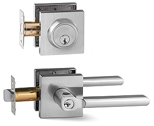 - Berlin Modisch Entry Lever Door Handle and Single Cylinder Deadbolt Lock and Key Slim Square Locking Lever Handle Set [Front Door or Office] Right & Left Sided Doors Heavy Duty – Satin Nickel Finish