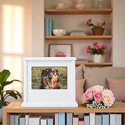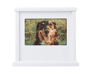 Cherish Your Beloved Pet: Honor the memory of your furry family member with this beautifully handcrafted white wooden pet memory box, designed to keep your pet close even after they’ve crossed the rainbow bridge. Fits Ashes for Pets Up to 75 lbs: This medium-capacity urn is suitable for medium to large dogs, cats, and other pets, offering a dignified resting place for animals up to 75 pounds. Store Meaningful Keepsakes: Spacious interior provides room for treasured mementos—such as collars, tags, small toys, or special items—so you can preserve the things that meant the most to your pet. Large Capacity for All Your Pet’s Treasured Keepsakes: The roomy interior is designed to hold all of your pet’s meaningful mementos—such as collars, tags, favorite toys, small blankets, or heartfelt notes—allowing you to keep every cherished item together in one beautiful memorial box. Displays a Favorite 4" x 6" Photo: Personalize your memorial with a 4" x 6" photograph of your pet, turning this memory box into a heartfelt display for any shelf, tabletop, or room in your home.