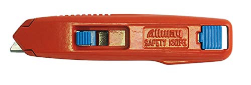 - Description The ALLWAY Self-Retracting Safety Knife is the ultimate tool for those looking for both safety and durability. Our engineers have carefully crafted a rugged engineering grade plastic body that is both lightweight and sturdy. The knife opens easily with a simple touch of a button, making it effortless to use. The rounded point blade is designed to reduce puncture injuries, making it perfect for a variety of applications. This knife is designed for both left and right-hand operation, with the option for short or long blade exposure. Plus, the metal wear strip beneath the blade edge ensures that this knife is built to last. With the ALLWAY Self-Retracting Safety Knife, you can rest assured that you are using a top-quality tool that is both safe and reliable. Adjustable cutting depth option, just snap off tab on slider Blade changes are easy with the unique EZ push button feature; no screwdrivers required Comes with 1 ALLWAY Round Point Blade within the knife Equipped with a metal wear strip for heavy use Internal steel metal wear guard designed to prevent blade breakthrough Rounded point blade helps reduce puncture injuries Self-retracting blade for safety Ultra light weight engineering grade plastic body Two possible blade extension lengths