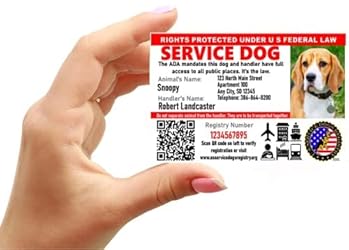 ONE HIGHEST PRINT QUALITY AT 600 DPI - Your professionally designed, full color, high definition ID card will be printed using the latest technology, Your photo and text will be transferred to the surface of the lightweight but extremely durable PVC card at 600 DPI and sealed into the PVC Composite Plastic. Size identical to a credit card (2-1/4” X 3.-1/3”) and imprinted with your dog’s photo, dog and handler's name, dog's registration number, and optionally microchip, address & phone number. FULL ADA ACCESS - This Service Dog Photo ID Card will reduce conflicts and challenges from uninformed individuals, allowing your service dog to enter shopping centers, airports, hospitals, restaurants, commercial buildings, hotels, cruise ships, grocery stores, buses, and airplanes per ADA laws. QR CODE REGISTRY LOOK-UP & DIGITAL ID - A unique QR code allows the ID to be scanned and the user is redirected to your complimentary working-dog registration on the U S Service Dogs Registry website. Your data will be entered into the registry and you will receive a complimentary digital copy. Digital IDs are sent via email to the address included on your customization form, the business day after your order ships. YOUR PHOTO IS EVERYTHING - Be sure to provide an original, full-color, uncropped photo of your Working Animal. We will edit and crop your photo to fit the IDs format. If the photo that you provide is unsatisfactory, your order may be delayed until you provide a replacement. CHECK TWICE BEFORE SUBMITTING - Please be sure to proofread your information as we print exactly what you put in the customization form. We are not responsible for any misspelled names, incorrect addresses, or phone numbers unless it is different than what you submitted. SECURITY SEAL FOR MAXIMUM CONFIDENCE - The Registry Seal is applied in full color with 600 DPI imaging as a security seal or digital certificate, authenticating the IDs are genuine. The quality of the seal makes our IDs nearly impossible to reproduce. Holograph seals tend to distort the image and lamination tends to peel. Our text and image is embedded and heat-sealed into a 30 Mil PVC card to make our IDs virtually impossible to destroy. ID HOLDER - Durable, premium, waterproof, badge holder that easily attaches to your dog's leash, harness, or vest. It fits your Dog ID perfectly, which is designed to minimize confrontation and help provide access to public areas. TSA & ADA COMPLIANT - Our ID's have been screened by TSA and meet all government requirements and regulations. FREE REGISTRATION - Customization information and photos allow us to create a free registration at U S Service Dogs Registry for you. A new registration number will be created for you unless you provide a previous registration number.