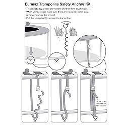 Choose American. Choose Certainty. Eurmax Canopy is North America’s #1 factory store, stocking all canopies, accessories, and patio umbrellas right here in the U.S. Rugged and Heavy-Duty:These galvanized steel heavy-duty trampoline ground anchors are crafted for durability, designed to withstand tough conditions and various weather, ensuring they hold up during energetic jumping sessions and windy weather. Easy Installation:Simply screw the spiral trampoline stakes into the ground with minimal effort. No specialized tools required, and the bonus T-hook makes setup and removal of the trampoline stakes quick and hassle-free. Enhanced Stability:Our trampoline stakes fit various sizes and shapes, anchoring the trampoline to the ground for increased stability. These canopy stakes are crucial in windy conditions to prevent tipping or blowing away. Bonus Belt for Additional Security:Wraps around the trampoline frame, connecting it more securely to the stakes for enhanced stability.