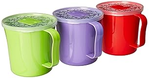 - Experience convenience and versatility with our Zilpoo 3-Pack Soup Mugs. These 37-ounce plastic cups feature a modern, stackable design that's perfect for soups, cereals, or any hot or cold beverage. The snap-on, flip-top lids prevent spills and messes, while the easy-carry handle stays cool to the touch. Measuring 5 inches in diameter and height, these microwave-safe and dishwasher-safe cups are BPA-free and come in a set of three vibrant colors - red, green, and purple.
