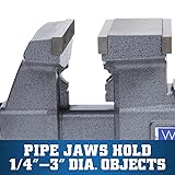 When in normal position, the jaw opening is 7-1/4", and 12-3/4" when reversed Built-in pipe jaws handle a range of pipe sizes Dual lockdowns and a 360° swivel base Replaceable hardened steel jaws with a serrated pattern ensure grip and a long life Two large anvil work surfaces for forming and shaping materials Backed by Wilton's industry-leading lifetime warranty against manufacturing defects
