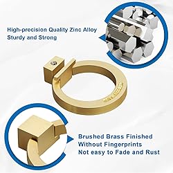 - Product Specification: ◆ Item Type: Cabinet Knobs Ring Pulls ◆ Finish: Gold ◆ Material: Zinc Alloy ◆ Diameter: 1.57" (40 mm) ◆ Thickness: 0.39”(10mm) Product Features: ◆ Made of Zinc Alloy, long lasting. ◆ Nice grip with reasonable spacing between the cabinet door from your fingers. ◆ Well match with all the furniture. Great helper to pull out cabinet,drawer,dresser, wardrobe, door soon and conveniently. ◆ Easy to be installed. It comes with two different length screws,so you can use which is best suited. If you have thicker board,you need to buy longer screws ◆ Individually wrapped to protect against scratches. Package Includes: ◆ 10 x Drawer Ring Pulls ◆ 10 x 0.86" Mounting Screws ◆ 10 x 1.77” Detachable Screws Installation Steps: ◆ Measuring hole spacing: Distance between the center of two screw holes; ◆ Drill hole: Find the position where you want to install the handle and drill a hole; ◆ Upper screw: Then pass through the screw from the back of board and thread tight to the knob. Sweet Tips: ◆ Color may be a little different due to monitor and light brightness from pictures. Thank you for your understands. ◆ Please allow a little size error due to hand measure.