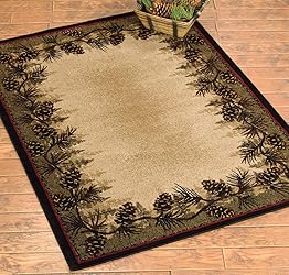 - A Black Forest Decor Exclusive - Give your room a nature-inspired update with the plush polypropylene Village Pines 5 x 7 Rug featuring pine trees and pine boughs in forest green, chocolate and gold. Fade and stain resistant with serged edges. Measures 5'3"W x 7'3"L.