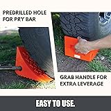 TOUGH AND DURABLE: Prevent up to 20,000lbs for trucks and trailers from unintentionally moving, rolling or overturning even on sloped surfaces WORKS IN ALL CONDITIONS: All-weather construction makes for reliable performance in any climate and treaded grips works on slippery surfaces. CONVENIENT TO USE AND NO SMELL: Predrilled hole for securing in pairs by rope or chain or pry off from tire and molded grab handle for easy positioning. PERFECT FOR ANY VEHICLE: Contoured to fit any wheel and is lightweight for easy storing EASY TO SEE, HARD TO FORGET: The highly visible orange color makes it more likely to be seen and removed before driving off and also makes it easy to be backed into.