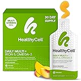 Complete Plant-Based Multivitamin: HealthyCell Daily Multi + Iron & Omega-3 is a vegan daily multivitamin for men and women that offers a broad spectrum of essential vitamins, minerals, and other vital nutrients that diets often lack. Everything you need to help fill nutritional gaps and support overall health in a tasty peach mango-flavored MicroGel. Ultra-absorbable MicroGel Vegan Multivitamin & Essential Nutrient Booster: Top nutritional scientists developed our smooth and flavorful MicroGel to deliver ultra-absorbable nutrients so you can Absorb More. Clinically proven to deliver 165% more absorption than tablets. All-in-One Formula Replaces 15 Pills: The future of vitamins is pill free. This physician and nutritionist formulated gel pack helps supplement nutrients that diets often lack with zinc, vitamin C, vitamin D, omega 3, magnesium, iron and other essential nutrients for overall vitality. Great-Tasting Experience: Tastes like a fruity peach mango gummy. For best results, take one gel pack daily to support overall health. Enjoy straight from the gel pack, mixed into a drink or blended into a smoothie. Store in the refrigerator and serve chilled for the best experience. No Junk: Formulated using only premium natural ingredients. No fillers, binders or coatings. Just delicious daily nutrition that works. Vegan, gluten free, soy free, and non-GMO.