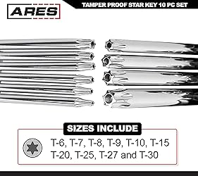 - Never Get Stuck Without The Right Star KeyThe ARES Tamper Proof Folding Star Key Set will ensure you're never without the security star key required to undo security fasteners, which are becoming increasingly popular on everything from cars to toasters to video gaming devices. Made of high strength Chrome Vanadium steel, this set of torx keys is made to last without shearing off. Plus, the included anodized lightweight aluminum rails will keep them organized, so you'll never need to go searching for the right one. Â Features: Â Includes 10 pc. star keys and 1 pc. aluminum storage railSizes: T-6, T-7, T-8, T-9, T-10, T-15 T-20, T-25, T-27 and T-30Constructed of high strength Chrome Vanadium steelRust and corrosion resistantLightweight, compact self-storageMatches nearly all standard tamper resistant security screws on the marketBuilt to meet and exceed ANSI/ASME specifications