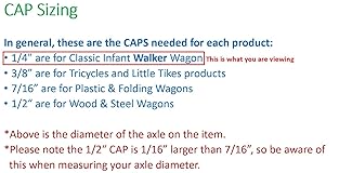 - Hub Caps for Popular Red Wagon Brand Model 12 Classic Infant WALKER Wagon, 1/4 inch. This is a set of 4 brand new red axle caps for a Popular Red Wagon Brand Classic Walker Wagon with installation instructions. If you have any questions please feel free to ask. Part SKU: 102765 Red Each cap measures 3/4 inch diameter across the base. Hole has a 1/4 inch diameter opening. For use on current popular red wagon brand including: - Model 12 Classic WALKER Wagon THIS WILL ONLY FIT Classic WALKER Wagon THAT HAS A 1/4 inch AXLE DIAMETER. PLEASE DOUBLE CHECK YOUR AXLE. NOTE: This is for a WALKER WAGON, not a big wagon. **Includes installation Instructions