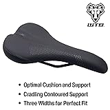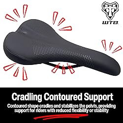 OPTIMAL CUSHION AND SUPPORT: Features medium padding thickness, striking the perfect balance between soft cushioning and firm support for comfortable, easier-paced riding CRADLING CONTOURED SUPPORT: The deeply contoured shape cradles and stabilizes the pelvis, providing essential support especially for riders with reduced flexibility or stability. THREE WIDTHS: Perfect Saddle Fit of the Sit Bones --- Experience unparalleled support with right saddle width for your sit bones (ischial tuberosities) which are in the Narrow, Medium, or Wide version of our best-selling WTB Volt saddle, offering correct sit bone support for enhanced ergonomic fit and optimal power transmission during all your cycling adventures, from trails to road rides. COMFORT ZONE FOR PRESSURE RELIEF: This cutout is an open area on the underside in the base of the saddle shell towards the nose that provides pressure relief for soft tissue by allowing the saddle padding to slightly push through the plane of the saddle base for extra comfort so you can ride longer and more comfortably. THE LOVE CHANNEL: Saddle padding relief down the middle on the top center of WTB saddles from the rear of the saddle to approximately 50 mm (2”) from the tip of the saddle nose that provides soft tissue relief and prevents unwanted pressure that would otherwise cause numbness.