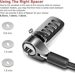 【For Devices Without Security Lock holes】There is a lock slot plate lined industrial grade double sided adhesive, bound the plate to the hard surface of the devices, then insert the locking head into the plate and loop the cable around a fixed object. 【For Laptops With Built-in Security Lock holes】Just simply insert the lock head into the slot, and loop the cable around a fixed object. 【UPGRADED 100% ANTI THEFT】The lock head is made of super strong stainless steel and double lever lock, thicker and firmer. One key lever push button with 360°rotating, design for one hand operation. 5mm diameter cut-resistant wire braided cable is 30% thicker than normal. Extra length of 6.23ft allows easy movement of device. 【Code Combination】The computer locks utilizes a 4 digit security code. This customizable combination allows you to have over 10,000 different and unique combination. no lost keys! 【PACKAGE INCLUDED】1*Laptop Combination Lock, 1*Double Sided Adhesive Lock Slot Plate, 1*Manual, 3*Spacer. Please contact us if there is any problem with our product. We promise you a 100% satisfaction resolution. No risk, order now!