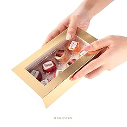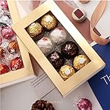 Paper Super Value Set: 20 pcs of exquisite truffle boxes with clear window. The packaging includes the paperboard sleeves and base with a PET tray Size: Exterior: 7" x 4" x 1.3", Interior: 6.2" x 3.2" x 1.25", PET Tray: 5.75" x 2.75", fits a single truffle size of 1" x 1" x 1". It can hold up to 8 standard size truffles Easy Assembly: The chocolate box is flat and pre-folded for easy assembly. It is also easy to disassemble and store for later use Function: This truffle box is big enough to hold both homemade and store-bought truffles. It is also suitable for chocolates and candy, as long as the size fits More Choice: Bakipack supplies different sizes of truffle boxes in the colors of white, dark brown, gold, and rose gold. Chocolate boxes for 4/8 are available for your option