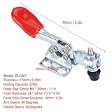 - Features: 1. 100% brand new and high quality. 2. Easy, safe and comfortable operation. 3. During clamping, the lever is controlled to prevent impact on functioning due to side thrust. 4. Suitable for quickly holding down sheet metal or circuit boards. 5. Widely used on during welding processing, riveting processing and other processing of fixture products. 6. A mechanical device for locating equipment or objects. Specification: Condition: 100% Brand New Model: GH-201 Material: Iron + Galvanized Length: 78mm / 3.0in Thickness: 1.5mm / 0.05in Holding Capacity: 27KG Press Rod Screw: M5 * 29mm / 1.1in Fixed Base size: 24 * 24mm / 0.9 * 0.9in Fixed Hole Center Distance: 14mm / 0.5in Arm Opens: 90 Degrees Handle Opens: 80 Degrees Weight: Approx.164g Package List: 5 * Toggle Clamp