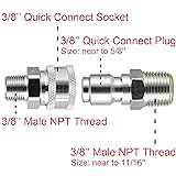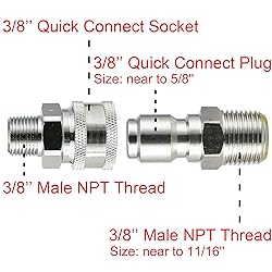 - Feature: 3/8''quick connect. Material: steel. The max working pressure is 4500 PSI. The max working temperature is 158 °F. Quick Disconnect Fitting: 3/8” quick coupler plug to 3/8” male NPT thread; 3/8” quick coupler socket to 3/8” male NPT thread. Application: 1.The steel pressure washing ball valve kit is designed for pressure washer hose. 2.It is easy to turn on and off. It offers great leverage under high pressure. Package List: 1 piece ball valve with 3/8'' female NPT 1 piece 3/8” pipe quick coupler plug. 1 piece 3/8” pipe quick connect socket.