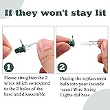 - Features: Installation/Replacement guide: Step 1: First unplug the lamp set; Step 2: Take out the broken lamp; Step 3: Confirm that the protrusions on the surface of the base and the grooves of the interface are aligned, and then gently insert the bulb base into the interface, just confirm The work will be completed without falling off, no need to backlog multiple times; Step: Replug the device to see if it is successful. If you have any questions, please consult our customer service and they will answer them promptly Light up your holiday: These mini wire light bulbs are suitable for indoor and outdoor use for tree, wreaths and garlands light bulbs, which can help you create a romantic and warm festival atmosphere for the upcoming holiday season. Specifications: 2.5 volts, 0.425 watt, 0.17 ampere Base height: 1.1 cm/ 0.4 inch Base diameter: 0.4 cm/ 0.16 inch Diameter at the interface between the base and the bulb: approximately 0.7 cm/0.28 inch Package includes: 100 x Replacement bulbs Notes: Manual measurement, please allow slight errors in size. The color may exist a slight difference due to different screen displays.
