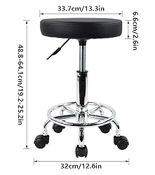 13.3 inch diameter and 2.6 inch thick Seat Cushion Provide a comfortable experience 360 Swivel rolling stools adjustable seat by Hydraulic gas lift make height from 19.2 to 25.2 inches Easy to assemble vanity stool,Assembly completed in 5 minutes,Holds up to: 250 lb; Stylish design garage stool Ideals for photography studio stool chairBarbershop,Bars, Pubs, Office,Coffee shops, home,etc. Leather Shop Stool,Seat Cushion is Made of PU Leather,water and oil proof
