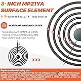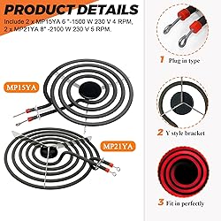 【𝙋𝙤𝙨𝙞𝙩𝙞𝙫𝙚𝙡𝙮 𝙍𝙚𝙫𝙞𝙚𝙬𝙚𝙙 𝙛𝙤𝙧 𝙎𝙩𝙪𝙧𝙙𝙞𝙣𝙚𝙨𝙨】---【UPGRADED】MP22YA Electric Stove Range Surface Burner Coil Unit Set is made of made of high temperature resistant stainless steel alloy material. Titanium is added to the stainless steel alloy, so our MP22YA surface burner elements has higher resistivity, higher temperature resistance, stronger oxidation resistance, better wear resistance, not easy to embrittlement, and smaller deformation when the burner works in the electric furnace.★The Burner Element solves the following problems for your stove:①The surface element is not heating up and the end connection was corroded.②Element will not heat.③Element will not start 【𝙈𝙋22𝙔𝘼 𝙀𝙡𝙚𝙘𝙩𝙧𝙞𝙘 𝙍𝙖𝙣𝙜𝙚 𝘽𝙪𝙧𝙣𝙚𝙧 𝙀𝙡𝙚𝙢𝙚𝙣𝙩 𝙆𝙞𝙩】--- Includes 2 × UPGRADED MP15YA 6" 4 coils Stove Burner Element 1500 watt 230v, 2 × MP21YA 8" 5 coils Stove Burner Element 2100 watt. The multiple turns of the coil can provide higher cooking performance, resulting in better heating performance, and you can better enjoy the fun of cooking.TIPS:☞MP22YA Electric Range Burner Surface Element have a "Y" bracket. This burner element is not suitable for GE and Hotpoint, please make sure your Y-bracket size is the same as ours, otherwise the product may not fit your drip pan 【𝙒𝙄𝘿𝙀 𝘾𝙊𝙈𝙋𝘼𝙏𝙄𝘽𝙄𝙇𝙄𝙏𝙔】--- 2026 UPGRADED MP22YA Stove Burner Replacement can replacement for Whirlpool, Hardwick, Kenmore, May-tag, Norge Electric Range Stove.▶MP21YA Replaces Part Numbers:WPY04100166, 4381750, Y0E00801799, 400178, 19950009, 1938-344, 1938-249, 15928, 0E00801799, 04100166, SU306, MP26YA, MP26M, MP21U, MP21MA, 7406P050-60, 74005447, 715928, 715928, 707457, 707457, 7-7457, 7-15928, 550072, 550072, 5-50072, etc.▶MP15YA Replaces Part Numbers:WPY04100165, Y707456, Y703422, Y0E00601299, MP15MA, MP12MA, 7406P048-60, 74005446, 715927, 707456, 703422, 7-7456, 7-3422, 7-15927, 550071, 5-50071, 4381748, 19950010, 15927, 0E00601299, 04100165, Y04100165, 1242501,etc 【𝙀𝘼𝙎𝙔 𝙏𝙊 𝙄𝙉𝙎𝙏𝘼𝙇𝙇】---The MP22YA surface burner elements, those metal components that get red-hot and generate heat, are the most important parts of any range. MP22YA Surface element kit easy to install.Before replacement, disconnect the power supply and wear working gloves to ensure the safety of your hands.When the elements fail to heat properly, it's time to replace them.Please check the dimensions as shown on the photos to ensure they fit your stove before puechasing. If the range burner does not sit flat on your stove, make sure the connection bolts are parallel and pushed a bit down 【365 𝘿𝙖𝙮𝙨 GUARANTEE】---MP22YA Electric Range Burner Element Unit Set supports 1-year warranty and a 90-day return & exchange.Our company attaches great importance to the shopping experience of each customer.★PAY ATTENTION---If the stove is not flat on the stovetop, make sure that the connecting bolts are parallel and push down a little bit. If there is a little smoke when MP22YA Electric Range Burner Surface Element is used for the first time, please don't panic. This is normal. This is a green coating applied by the factory to prevent scratches during transportation
