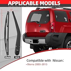 - Please check the picture carefully to make sure that the part is what you need. Replacement rear wiper arm attachment with cover cap and wiper blade. The joint between wiper blade and wiper arm is consistent with the original car. Perfect item for keeping the rear windshield clear of water and debris. Direct replacement, Easy Installation. Fitment: Replacement for 2005-2015 Nissan Xterra Specifications: Package includes: 1X Wiper Arm & Cover 1X Wiper blade Size: Blade Length: 12 "(300mm) Installation: 1. Joint the wiper arm with the cross-pillar, which is in the middle of the wiper blade. 2. Put in vertical direction. The wiper arm would be stuck in the blade. 4. Install the whole kit in the window. Done Note: Make sure all plastic/ metal is removed from the wiper motor sharf before installation! ( As picture shown above) Note: Don't forget to remove the hard plastic protective cover from the rubber blade before use. Please read all description & size before ordering the product. Your satisfaction is our utmost concern. Please contact us to resolve any issue