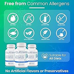 - L-methylfolate: Folate is a form of B vitamin that occurs naturally in many foods. Folic acid is the man-made form of folate that is added to processed foods or vitamin and mineral supplements. Folate is needed in the human body for the production of red blood cells. Vitamin B12: Essential for the production of red blood cells. Vitamin B6: Essential for mood regulation as it is responsible for producing neurotransmitters that regulate emotions. Why Choose Folate Maxx? Millions of Americans are folate deficient and have a mutated gene preventing the absorption of folate or folic acid. Our L-Methylfolate is able to be synthesized and absorbed into the blood compared to folic acid. 5-mthf supplement contains professional strength 5-methyltetrahydrofolate, the biologically active form of 5-methyltetrahydrofolate, which is able to reach the central nervous system. Folate MAXX L-methyl folate is a dietary supplement for use in people who have conditions related to folate deficiency. Methylated folate can cross the blood-brain barrier to help facilitate the synthesis of the neurotransmitters associated with mood regulation. Bringing nothing but the best to you! We deeply care about your health & well-being which is why our b complex supplement is: -Gluten-free -Wheat free -Yeast-free -Dairy-free -Lactose-free -Soy-free -Shellfish-free -Egg-free -Non-GMO -Additive, filler & preservative-free -Made in the USA
