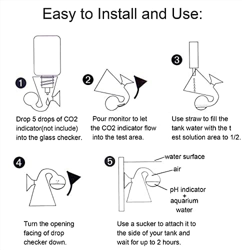 - Easy to install and use: Make sure your test kit is clean. Drop 5 drops of CO2 indicator(not include) into the glass checker and use straw to fill the tank water with the test solution area to 1/2. Then turn the opening facing of drop checker down. Use a sucker to attach it to the side of your tank and wait for up to 2 hours.