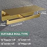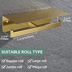 PRACTICAL LARGER SHELF: keep daily items in orderly, convenient for you to place cell phone, wet wipes, facial tissue, etc. With upward bend edge, protect stuffs from slidding off SUPPORT MULTIPLE SIZES ROLL: double support rod have upward end hook, hold 2 paper rolls firmly, always have a backup. Fit regular/ large/ mega/ jumbo rolls, EXCLUDE other oversized rolls. Please take measurements of your paper roll correctly before purchasing EXQUISITE CRAFTSMANSHIP: premium 304 stainless steel with brushed gold, resist daily rust. Luxury golden appearance, add gorgeous style to your bathroom FUNCTIONAL TOILET PAPER HOLDER WITH SHELF: keep toilet paper while adding a spacious space to place daily items on, serve different usage needs WALL MOUNTED DESIGN: utilize wall space to storage, daily stuffs can be placed on the wall to liberate more counter space, promote space efficiency