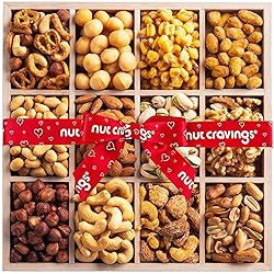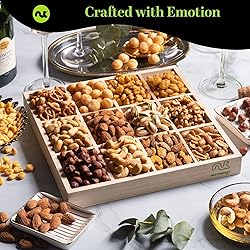 A SELECTION OF 12 OF OUR BEST NUTS: Our Red Ribbon Nuts Wooden Tray includes a handful of 12 of our signature nuts: Bar Pretzel Mix, Honey Roasted Peanuts, Raw Hazelnuts With Skin, Raw Walnuts, Roasted Salted Almonds, Roasted Salted Cashews, Roasted Salted Crunchy Corn Kernels, Roasted Salted Macadamia, Roasted Salted Peanuts, Roasted Salted Pistachios, Smoky Snack Mix and Toffee Peanuts TOP 'NUTCH' WOODEN TRAY INCLUDED: Our snacks come in a high-end wooden tray that makes it easy to share them with the people you love ELEGANT RED & GOLD RIBBON: High-end sectional wooden tray including an elegant red & gold ribbon that will definitely impress your gift recipient NUTRITIOUS & HEALTHY: Can snacks really be both delicious and healthy at the same time? Yes, they can. Our snacks are both mouthwatering and a great source of proteins, protective antioxidants, fiber, enzymes, and immunity-boosting vitamins ATTENTION: Please remember to Check the box labeled "This is a gift" in your cart or at checkout and write a personalized message. The last thing you want is your recipient to receive such an incredible gift and not know it was you who treated them