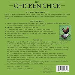 Designed for maximum protection, safety, and comfort by backyard chicken keeping author and consultant, Kathy Shea Mormino, The Chicken Chick Extra-wide shoulder, wing, and back coverage Sturdy, lightweight duck cloth material for durability and comfort Camouflage pattern provides a degree of protection from predators Reinforced stitching retains fabric shape and fit during wear and washing Double snaps for safety Machine washable and dryable Will fit breeds such as Cochin, Marans, Orpington, Wyandotte