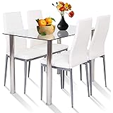 Binrrio 5 Piece Dining Table Set, 43 Inch Rectangle Tempered Glass Top Table, 4 High Backrest Leather Chairs, Modern White Dining Set