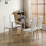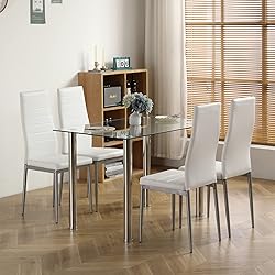 ♥【Sturdy Table Top】Crafted with an 8mm tempered glass and seats over a sturdy, powder-coated steel frame, so this dining set can be use for many time. The load capacity of Table Top is up to 155lb. ♥【Elegant and Concise Design】Meticulous rounded corner design ensures safe use of the product. Four Cushioned chair top material connect with sliver iron pipe. Stool seat is padded with sponge and covered with PU leather. It makes your room looks like more modern and fashion ♥【Comfortable Seat】Padded with sponge and covered with PU leather which makes you feel soft and comfortable while sitting on it. High back chairs provide unexpected comfort for you and your families ♥【Perfect for 4 Persons Dining】Includes a table and 4 chairs, Perfect set for your home's dining room area. Whether you are looking for extra seating in your breakfast nook or dining room or use it as an entertaining station, this 5-piece set is the best choice ♥【Easy to Assemble】This product has straight forward illustrations and descriptions. Every screw and pin has its own code and it's easy to understand the assemble progress. It won't take you much time and could save your energy.