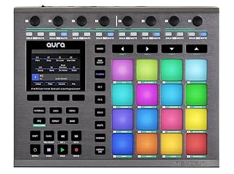 - AURA’s 16 RGB-illuminated pads are great for finger drumming and trigger at the lightest touch. Even better, everything is set up for you already when running the AURA Beat Composer with Nektarine – including mapping for many VST, VST3 and AU drum instruments. The pads on this MIDI Pad Controller are also highly customizable: Tweak pad sensitivity to your needs and playing style by choosing one of 4 different velocity curves with adjustable bias parameter. Pad pressure is assignable to Aftertouch, Pitch Bend or other MIDI CCs. And you can not only set a dedicated MIDI channel for each pad, you can even route the MIDI In note to a different MIDI note (eg. when playing a multi-sound plugin, and wanting to browse the sounds in that patch from one pad). AURA’s on-board Pad Repeat engine is directly accessible, offering a dedicated on/off button and settings menu. Use Repeat to create rolls or other percussive lines, that would be hard to play by hand. The repeat settings are highly customizable with realtime parameters for groove and speed control – all right under your fingertips on AURA’s 8 potentiometers. Looking for some instant Trap-style hihat lines? The first 6 RGB LED buttons right above the display switch repeat rates in realtime. Create truly dynamic rolls by using pad pressure to control velocity while changing the repeat rates with the LED buttons. Other parameters include Repeat Rate, Gate, Accent Interval, Accent Velocity Offset, Swing, Trigger Mode and Clock Source. The on-board hardware step sequencer is a great tool for creative beat composition. Press AURA’s ‘SEQ’ button and the 16 LED buttons below the pots become the much loved classic 16-step programming interface. 16 Collections of 16 patterns each provide plenty of room for your groove ideas. Each pattern (one per pad) has a total of up to 64 steps split across 4 parts. AURA’s sequencer is all about interaction and performance: Parts may be triggered in any combination at any time, so you can create new variations very intuitively. Each pattern, and even each part in a pattern, can have a different length – massively simplifying the creation of poly-rhythms. Reassigning patterns to new sounds is also easy: As there is one pattern per pad, it is just a matter of adding a slot in Nektarine with a new plugin – and the new sound is playing for that pad and pattern. You don’t even have to stop the sequencer to do this. Realtime editing: Change the Play Rate, dial in a fixed Velocity and Accent Level Offset, set a Length for the events or add Swing for an extra-helping of groove. Many of these features go all the way down to step level. Last Step allows you to adjust the step length for each of a pattern’s parts independently. Power user features: Dive as deep as you like – many parameters can be edited with up to step level precision. Simply select the pattern, part and steps you want and change the values for one or multiple selections at the same time. Group editing of Velocity, Play Rate or Gate Length across 4 parts or patterns in groups of 8 patterns at the same time is also possible. A great way to check and edit values across multiple steps without having to select them first. Synchronization: Internal and external clock modes ensure perfect sync with the outside world. AURA and the sequencer may also be used stand-alone with external MIDI instruments connected directly to the MIDI Out jack. Of course you can load an instrument plugin onto a track in your DAW and play it right away – but the fun really begins, when you make your own kits & sounds by combining multiple plugins in Nektarine: Create kits with up to 16 different instrument plugins, 64 insert FX-plugins and an additional 4 send FX. All of this playing on one track in your DAW. And we are talking any VST, VST3 or AU plugin here – including total recall for your kit. Simply load the Nektarine plugin into any DAW that is compatible with VST, VST3, AU or AAX (meaning virtually any current DAW, be it Ableton, Pro Tools, Cubase, Logic, Bitwig or Studio One), scan your plugins and you are good to go: AURA can now control your installed VST and AU plugins directly from the hardware! Existing instrument patches can also be imported into Nektarine’s powerful database (for many instrument plugins we offer their factory patches as downloads ready for import). And before we forget: AURA includes a license for the Nektarine stand-alone application. This lets you create beats easily by sequencing your instrument plugins directly from AURA, drum-machine-style: get groovin’! Start by loading a multi-sound drum plugin like Groove Agent, one of the many Kontakt libraries, or any other drum plugin – instantly taking over AURA’s 16 pads. Don’t like the snare? Replace it! Play the pad, press ‘Add Slot’ in AURA’s pad setup menu, browse your patch library on the TFT color display and load a new plugin. Any pad can be reassigned to a new plugin by creating a plugin slot and loading a patch or plugin directly from AURA’s browser. AURA’s patch browser lets you also filter for particular plugins, categories or tags to quickly zoom in on the sounds you are looking for. The best is, that a patch automatically loads the plugin it belongs to – so finding that “perfect” kick or snare drum for your track across multiple plugins becomes a matter of seconds. Keep adding instrument plugins until you have a different one playing on each of the 16 pads, their key ranges can also overlap for sound layering. Mix your kit using Nektarine’s software mixer with panning and volume control per plugin – and by adding FX plugins: 4 insert FX slots per plugin as well as 4 additional global send FX slots provide plenty of processing options. The FX plugins can be loaded and tweaked from AURA, using the two dedicated “FX” buttons for instant access to inserts and sends. Your kit, including all of the FX configurations and pad assignments 