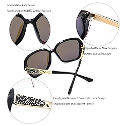 UV400 PROTECTION: HD polarized lenses effectively reduce glare and block 100% of harmful UVA and UVB rays; safeguard your eyes from long-term damage; experience clearer, sharper vision with enhanced comfort STYLISH & UNIQUE DESIGN: Classic oversized frames with crystal decorations; elegant and fashionable look; enhance your personal style while providing superior eye protection; perfect for fashion-forward women DURABLE & COMFORTABLE: Constructed with high-quality composite frames and lenses; integrated nose pads and reinforced metal hinges ensure durability; lightweight design provides lasting comfort throughout daily wear COMPLETE GIFT SET: Includes polarized sunglasses, paper box, soft storage pouch, lens cleaning cloth, and polarization test card; ideal practical gift for family and friends VERSATILE FOR ALL OCCASIONS: Ideal accessory for outdoor activities such as shopping, driving, traveling, or casual walks; suitable year-round for summer sunshine and winter glare; combines practicality with high fashion