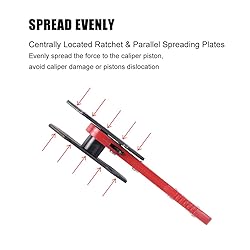 - HOW TO CHECK IF YOU NEED THIS TOOL OR NOT? 1. You will do some brake jobs 2. Your disc brake system has twin, quad and sextuplet pistons fixed calipers, or single and twin pistons floating calipers 3. Your caliper pistons do not require being turned when pressing them back 4. The spreader can expand from 1-1/2" to 2-1/2" for 2PCS small spreader plates, and 2" to 3" when adding 2PCS big spreader plates. If your caliper is wider, you can use old pads to lay across and then use this to push pistons back in 5. You want to save your time and effort, and protect your piston from a block of wood, a C clamp LABORSAVING RATCHET DESIGN 360 degree swing ratchet designed spreader, it is easy to get into place and use from any direction SUPERIOR SPREADING PLATES Four 1/8" thick spreading plates keep parallel, make sure to spread the force on the caliper piston evenly, in case of caliper damage or pistons dislocation Two small spreading plates used for twin and quad pistons fixed calipers, or single and twin pistons floating calipers. And two big ones for some sextuplet pistons fixed calipers HANDY LEVER HANDLE Red cushion lever handle, skid resistance and feel good, will not hurt your hand while using CONVENIENT REVERSING SWITCH There is a small positive and negative regulation switch on the ratchet, you can flip it to realize the conversion of expand and retract spreading plates NOTE 1. Please wear gloves and goggles when use 2. The brake caliper press tool should be used by professional or under the guidance of a professional 3. Always refer to equipment manufacturer's operation instruction 4. Because of ratcheting mechanism, both spreading plates need pressure to catch the ratchet, to move the plates together/apart 5. This brake caliper press tool suits for disc brake, not for drum brake