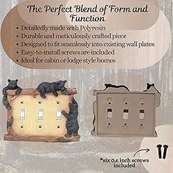 Realistic Black Bear Triple Switch Cover: Bring the outdoors indoors with this lifelike scene of three black bears climbing logs. This triple toggle switch cover is perfect for adding a touch of nature to your cabin or lodge-style home. High-Quality Polyresin Construction: Crafted from durable polyresin, this switch cover is built to last. The detailed sculpturing and realistic textures make it a stunning addition to any room. Versatile Design: This switch cover is compatible with standard 3-gang toggle switches, making it easy to install in your home. Easy Installation: Includes 6 screws for hassle-free installation. Simply remove your existing switch cover and replace it with this decorative piece. Dimensions for Perfect Fit: With dimensions of 7.5" x 1.4" x 5.9" (including log decoration) and plate dimensions of 6.25" x 4.75", this switch cover is designed to fit perfectly in your wall, ensuring a seamless and professional look.
