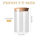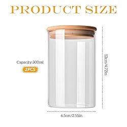 - Material:Glass, Bamboo. Colour:Transparent body, bamboo color lid. Capacity:200ml/ 300ml available for your choosing. Size: 200ml:8 x 6.5cm/3.14" x 2.55"(H * D). 300ml:12 x 6.5cm/4.72" x 2.55"(H * D). Packing including: 2pcs of each order. The main body of the bottle is made of high borosilicate glass, which is chemical corrosion resistance, and no harmful substances free at high temperature. It is the most hygienic and safe glass in our daily life. It is often used to make premium milk bottles and some red wine cups. The glass material is resistant to high temperatures, it can also be taken out from the refrigerator and immediately filled with boiling water. It is beautiful, practical and convenient. The transparent glass bottle body can clearly identify the contents inside. The bamboo lid with sealing ring make the inside food cut off from the outside to keep your food fresh. Transparent glass material, combined with meticulous manual technology, makes the bottle always show people's brilliance inadvertently. This glass bottle with bamboo lid is not just your normal storage bottle. It's also a fashionable decoration in your kitchen. Suitable for snack, candy, chocolate, dry flower, dry fruit, grain, bean, tea-leaf, caffee, sugar, salt, nuts, honey, jam, maple syrup, blackstrap molasses, caramel and more