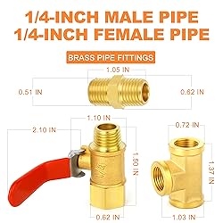 【DURABLE】: Not a cast product, more robust and durable than castings. Max. pressure 150 PSI. 【MATERIAL】 Durable solid brass construction is resistant to corrosion and long-lasting. 【THREADS】 Male and Female National Pipe Taper (NPT) threads for connecting two pipes,NPT thread size does not actual diameter, it is only nominal pipe size. 【INCLUDE】 2 x 1/4" NPT Hex Nipple; 2PCS 1/4" NPT Tee Fitting; 2PCS 1/4" NPT Ball Valve 【TEMPERATURE RANGE】 Operating temperature range of -65 to +250 degrees F.
