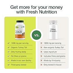 Potent Dosage of 1500mg Turkey Tail per Serving: Support your immune health with a pure dose of organic turkey tail (trametes versicolor) Extracted with the highest cleanliness standards in the industry. Our organic turkey tail is extracted using hot water, the best method for superior potency & absorption. Made from organic whole turkey tail mushroom - not mycelium. Free from fillers and grains. Made in the USA in our own facility that is FDA registered and GMP certified. This certification means that every aspect of the Fresh Nutrition manufacturing process has been examined, including our laboratory/testing methods (for stability, potency, and product formulation). Third-party Tested for potency and purity. Vegan, non-GMO, gluten-free, soy-free, no fillers or additives. 1 month supply, 90 vegetarian capsules.