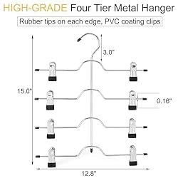 4 Tier Skirt Hanger: Dipping plastic protection is used on the head of clips. With the 2 non-slip coated clips keep your pants and skirts gently on the hanger. Adjustable clips are suitable for kinds of clothes Skirt Hangers Space Saving: A compact multi-hanger can hold up to 4 skirts, pants, jeans, or shorts on 1 hanger, that helps you easier to organize your clothes and save much-needed closet space Multiple Clips Hanger: The clip can easily slide along the round bar to suit clothes of various sizes. Suitable for adults, teenagers and children Multiple Pants Hanger: These hangers are perfect for hanging skirts, pants, jeans, work trousers, maxi dresses, leggings, and shorts Special Design Package Bag: Special safe designed package bag to pack these hangers to ensure all hangers are well protected during shipping