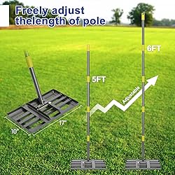 🌱 Level the soil and dirt evenly. Eliminate unnecessary tilting and turf by filling up the dirt and leveling it with lawn leveling rake. 🌱The ground plate is 17 "x 10". The perfect size for easy movement, function and maneuverability. 🌱The 6-foot extra-long handle makes it easy to cover more ground. If needed, the removable handle section can be shortened by 50 inches. 🌱Cormorants can work on any type of grass, including Bermuda, Kentucky Bluegrass, Ryegrass, St. Augustine and Fescue. This works best when the grass is cut to 1.5 inches or less. 🌱Double spot welded stainless steel structure. Total weight is 6 pounds.