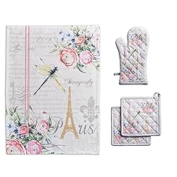 Cotton Made from 100% cotton, each product in this collection is just as elegant and charming it can be and brings out the spirit of the warm season in an artsy way. EASY CARE & MAINTENANCE: Machine wash warm with like colors, do not bleach, tumble dry low and warm iron if needed. PACKAGE INCLUDES: Set of 2 Kitchen Towels, 1 quilted Oven Mitt & 2 quilted Pot holder. UNIQUE DESIGN: This delicate collection is inspired by the beautiful town of Colmar, in the Northeast of France - also known as 'Little Venice. With its ancient houses and flower decked town centre, this land of wines is idyllic. Made in India