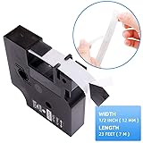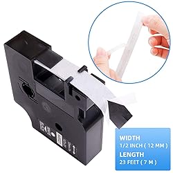 1/2” W x 23’ L (12 mm x 7 m). White print on black. 4-Cartridge compatible with dymo 45021 s0720610 labeling tape cassette The 1/2 inch label maker tape is compatible with DYMO LabelManager 100, 120P, 160, 200, 210D, 220P, 260P, 280, 300, 350, 350D, 360D, 400, 420P, 450, 450D, 500TS, PC, PC II, PnP, dymo Wireless PnP, COLORPOP, dymo LabelPoint 100, 150, 200, 250, 300, 350, dymo Label Writer 450 Duo The compatible dynamo black label tape is suit for indoor and outdoor applications, including homes, offices, schools and hospitals and other places These replacement 45021 refills are great for stick to most flat, clean surfaces including plastic, paper, metal, wood and glass. Safely removed without leaving sticky remnant. Split backing makes easy to peel off. Durable and long lasting, because the tape are water-proof and sunlight-proof and endures temperatures from 0 to 194 degrees This black label with white letters makes the label more eye-catching on some places. Not only for labeling files, folders, books for office supplies but also for labeling seasoning jar, drinking glasses for kitchen, and some others