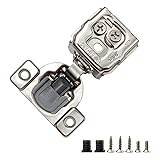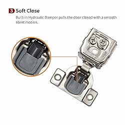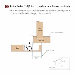 - SPECIFICATION:Cabinet Type: Face FrameOverlay: 1-3/8 InchOpening Angle: 105 DegreeStandard Cup Diameter: 1-2/5” (35 mm) Cup Depth: 2/5” (11 mm) Screw Hole Distance:1-4/5” (45 mm) MATERIAL: Cold Rolled-SteelFINISH: Nickel Plated3-Way Adjustments: Side (-2mm +2mm), Depth (+2mm -2mm) and Height(+2mm -2mm) Closing Type: Self, Soft-Closing Design with Built-In DamperInstallation Screws: Included. PACKAGE INCLUDES: Cabinet hinge bodyMounting screwsDowels