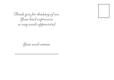 - Mail carrier thank you postcards to give to your customers anytime, all year-round. Give a card to say thank you for a gift received from someone on your route. Postcards measure 4.25x6 inches 25 postcards per pack. The artwork is of an LLV Backside says "Thank you for thinking of me. Your kind expression is very much appreciated. Your mail carrier,___________"