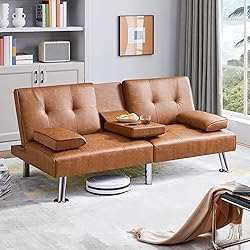 BUILT FOR COMFORT & DURABILITY: Supported by Chrome-plated steel legs and an engineered wood frame, this convertible futon bed boasts a high capacity of up to 772 lb. Resilient foam cushions are upholstered in skin-friendly faux leather, offering extra comfort and easy cleaning. CONVERTIBLE WITH 3 BACK POSITIONS: This 3-seater futon couch features a click-clack folding contraption to lock the backrest at 105° for comfy sitting, or 140° for lounging, or even lay the back down flat to create a 62.5″ W × 37″ D platform bed for two adults. USER-FRIENDLY FEATURES: For ease of use, this convertible sofa has a drop-down table with two cup holders to hold drinks and snacks when you enjoy your leisure time on it. The two throw pillows offer extra support for your lower back or head. CONTEMPORARY STYLE SOFA: The solid-hued faux-leather upholstery contrasts with the glossy chromed legs for a luxurious appeal, while the buttonless-tufted details dot the seat and the back for a touch of texture. This convertible futon perfectly matches the modern or contemporary interior design. MAINTAIN WITH EASE: This convertible futon is wrapped in water- and oil-resistant faux leather, so you don’t have to worry about spilled drinks or oily stains. Just wipe them with mild cleaners and a damp cloth, then your sofa will be as clean as a whistle!