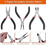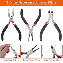 Complete jewelry making kit includes 3 pliers, wires, cords, needles, charms, findings and more, perfect for jewelry making, repair and DIY projects Comes with essential jewelry pliers - round nose, wire cutting and chain nose pliers with non-slip handles for safe use 100 assorted tibetan silver metal charms and a variety of jewelry findings like jump rings, clasps, pins and more Helpful accessories include thimble ring, scissors, tweezers, tape measure, needle threaders, awl and caliper for convenience Portable black zippered pouch neatly organizes all jewelry making tools and keeps them secure