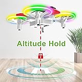 A Great Gift for Kids: High quality crash proof design, without worry about your kids get hurt from the falling aircraft. Meanwhile, protect the propellers and motors better. Easy To Play: 3 speed modes, you can adjust the speed to meet your operation proficiency. The Auto-hovering function enables the drone to hover at current height when you release the throttle stick, more stable to achieve flips and rolls. Lots of Fun: You can start the drone with one key take off button, and perform 3D flip. The LED lights give it a WOW factor that will impress your child and their friends. Bright and eye catching, so much fun to fly anytime. Won' t Lose Direction: In headless mode, you will not have to worry what direction the drone is facing, especially when it is fly out of your sight. 15 Minutes Flight Time: Come with 2 drone batteries in the package, your flight time is prolonged up to 15 Minutes.