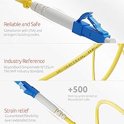 Superior Performance: Beyondtech UPC Single mode LC to LC Fiber Cable supports 10GBASE-L/E, 1000BASE-LX, ATM, Fast Ethernet, Fiber Channel & Gigabit Ethernet, ensuring stable video, data, and voice transmission for data centers & commercial networks. OS2 Network Optimization: Laser-optimized G.657.A2 single mode fiber optic cable offers reduced bend loss sensitivity, ideal for indoor installations on walls, ceilings, conduits (FTTH) & other irregular surfaces, maintaining stable signal integrity. Standards Compliant: Conforms to TIA/EIA 492AAAA and IEC 60793-2-10 A1b standards and meets RoHS specifications, this fiber optic Ethernet cable ensures consistent optical performance and compliance with global environmental safety regulations. Low Signal Attenuation: Delivers 0.36 dB/km at 1550 nm & 0.22 dB/km at 1310 nm, supporting long-distance fiber communication, making this LC to LC single mode fiber patch cable perfect for GPON, FTTX & high-performance passive network applications. Flexible and Durable: Operates from -40ºC to +75ºC with a minimum bending radius of 5 cm during installation and 3 cm for long-term use. The yellow-jacketed 3.0 mm fiber Ethernet cable allows easy handling, compact installation, & lasting durability.