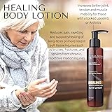 LOOSENS LOCKED OR STIFF JOINTS - Our Healing Body Lotion soothes and loosens frozen, locked or stiff muscles, joints and tendons whether its from chronic or acute injuries such as A locked up shoulder, tennis elbow, trigger thumb, Arthritis, or bruises, fractures, sprains and other soft tissues injuries from chronic, repetitive motion injuries or more recent incidents. MOISTURIZER & HEALER IN ONE - Massage this body lotion on to moisturize and soften your skin while promoting healthy bones, muscles and tendons to keep your body moving. SOOTHING & HEALING INGREDIENTS - Formulated with warming, nourishing herbal extracts such as Arnica & Comfrey and essential oils that promote circulation and healing; this organic lotion enhances mobility and healing from everyday wear and tear, repetitive motions or injuries to skin, bones, tendons and muscles. NON-GREASY & LIGHTLY SCENTED FOR HOME OR PROFESSIONAL USE - Whether that old football injury limits you or constant typing is causing your wrists to always hurt, you can loosen stiff, swollen joints and promote healing naturally with this therapeutic, lightweight lotion. This topical cream is also great for use by massage therapists, athletic trainers, or other professionals looking for an all natural remedy for pain. SIZE: 4 oz | 120 ml